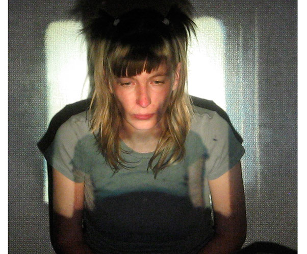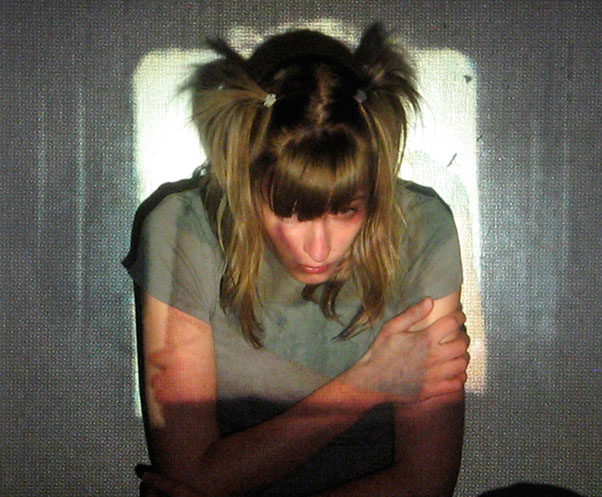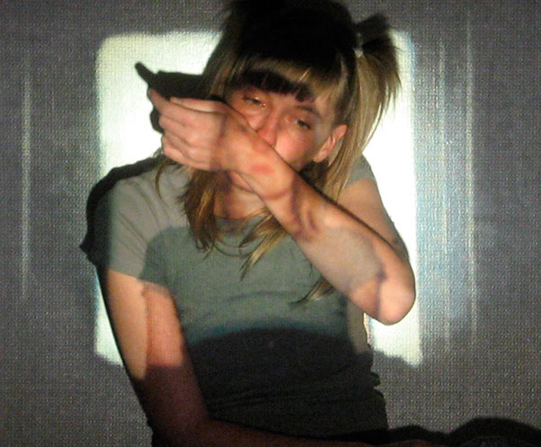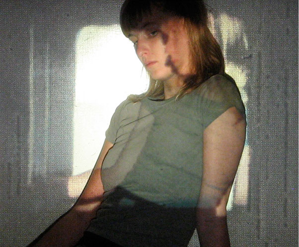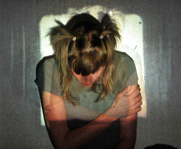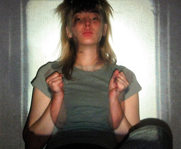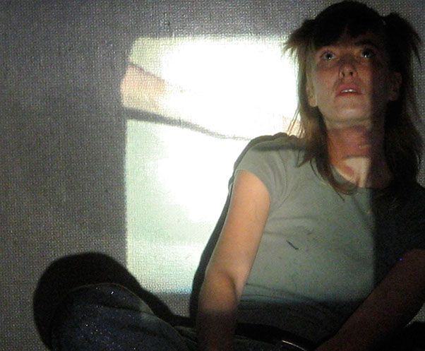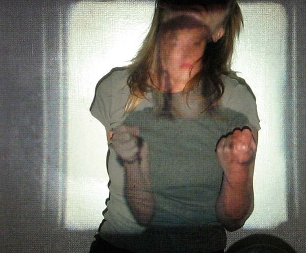 El registro de una acción en vivo. El ejercicio es el siguiente: me tomo fotografías sentada en cierto espacio, para proyectarlas posteriormente con un proyector de diapositivas en ese mismo lugar. Al proyectar las fotografías me coloco, de nuevo, frente a las imágenes, buscando así mi lugar dentro de ellas.