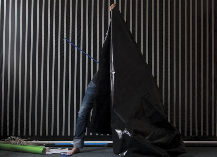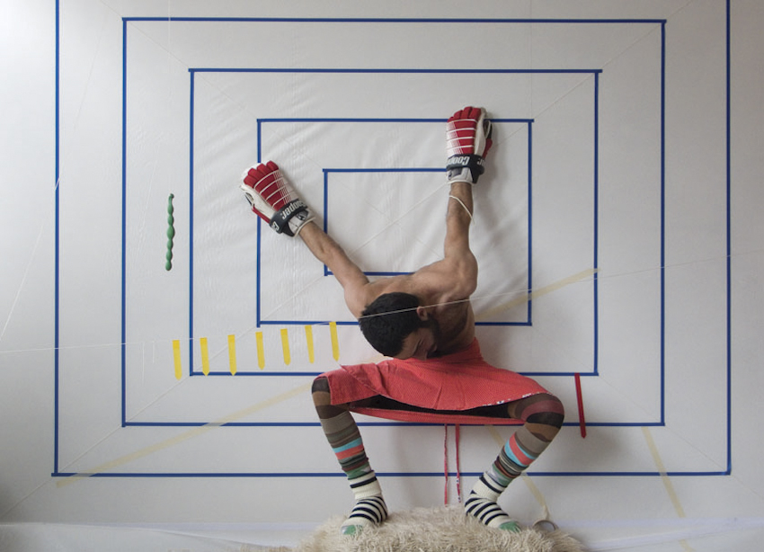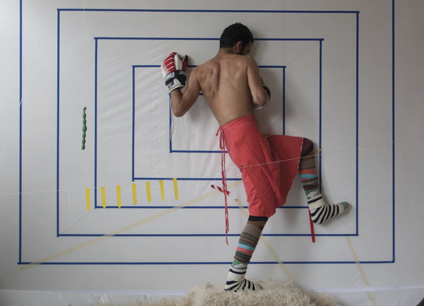 Espacio dispuesto, obra dispuesta desde condiciones geométricas, formas que en su recorrido se encuentran con un cuerpo que las habita, con el pliegue de la piel que se dibuja entre la composición.