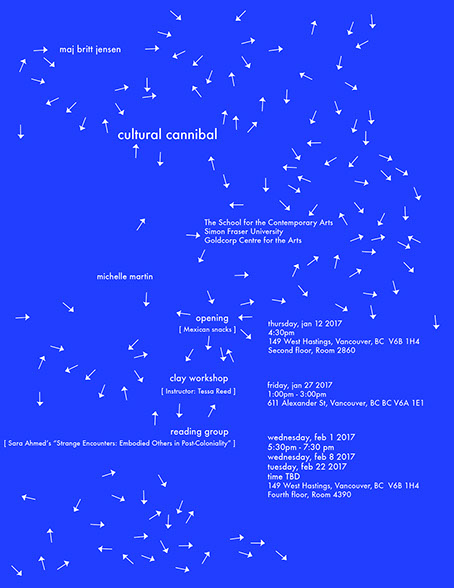 cultural cannibal usa la noción de antropofagia de Oswald De Andrade, que fue retomada en los años 60s por el Neoconcretismo brasileño. Aquí antropofagia significa consumir otra cultura, y se refiere a la interacción compleja entre culturas dominantes y marginadas. A través de su materialidad, estos objetos señalan el contacto cultural y relaciones encarnadas, los encuentros y las migraciones, y los límites y el potencial latente en estas interacciones.